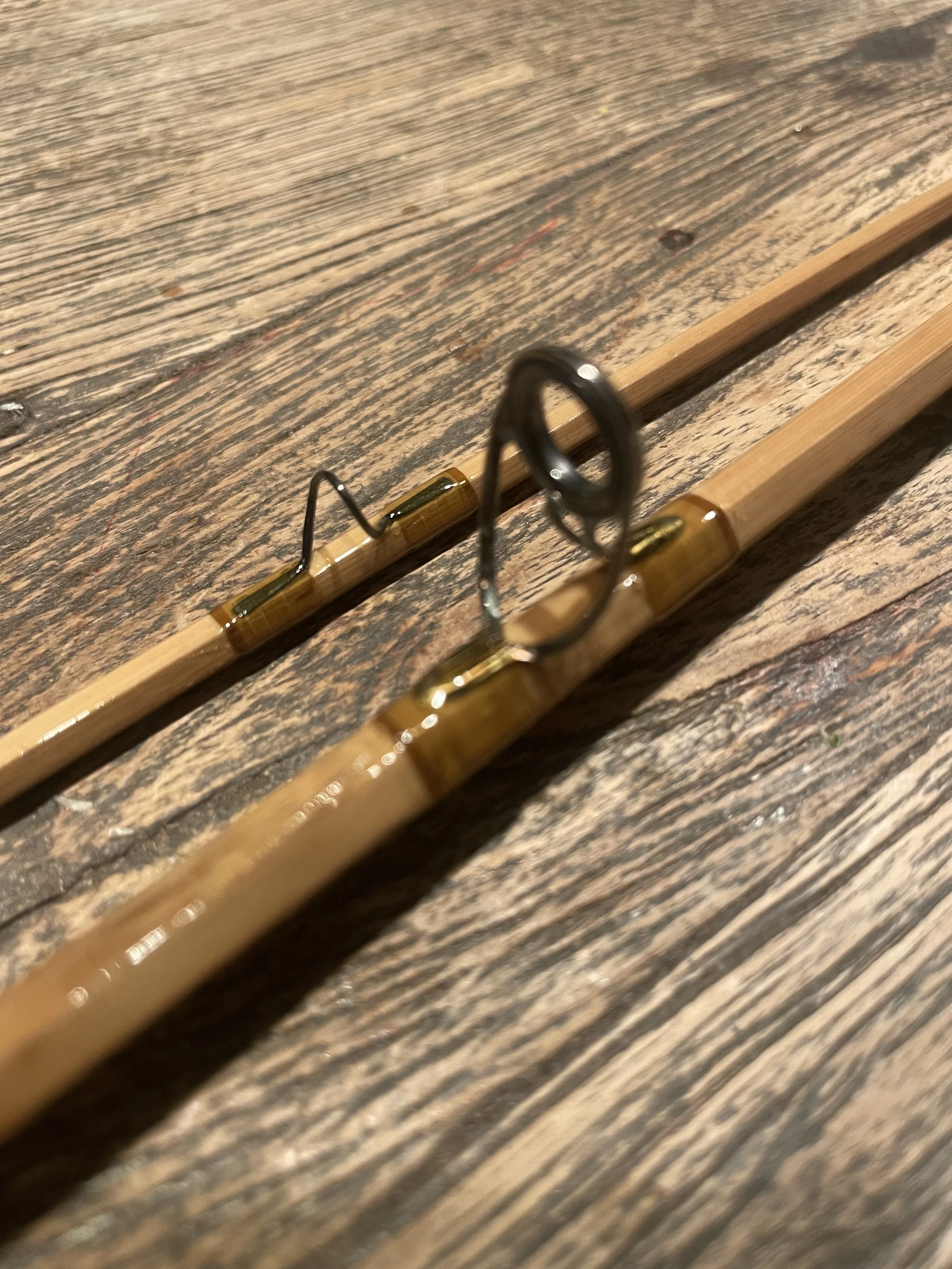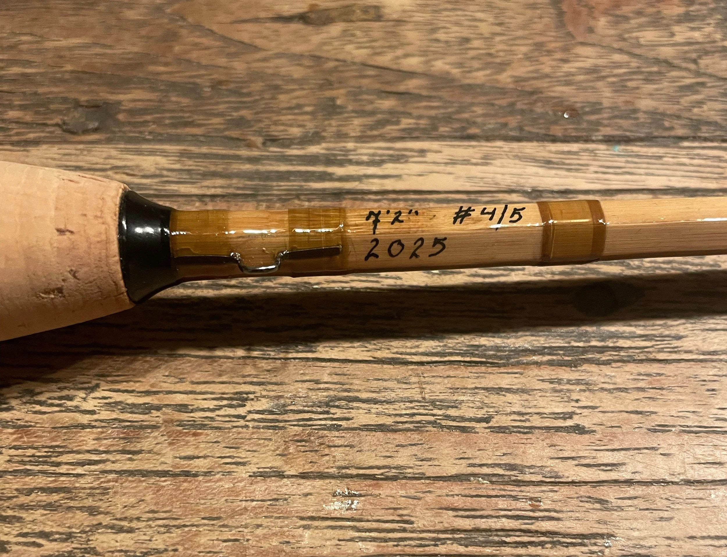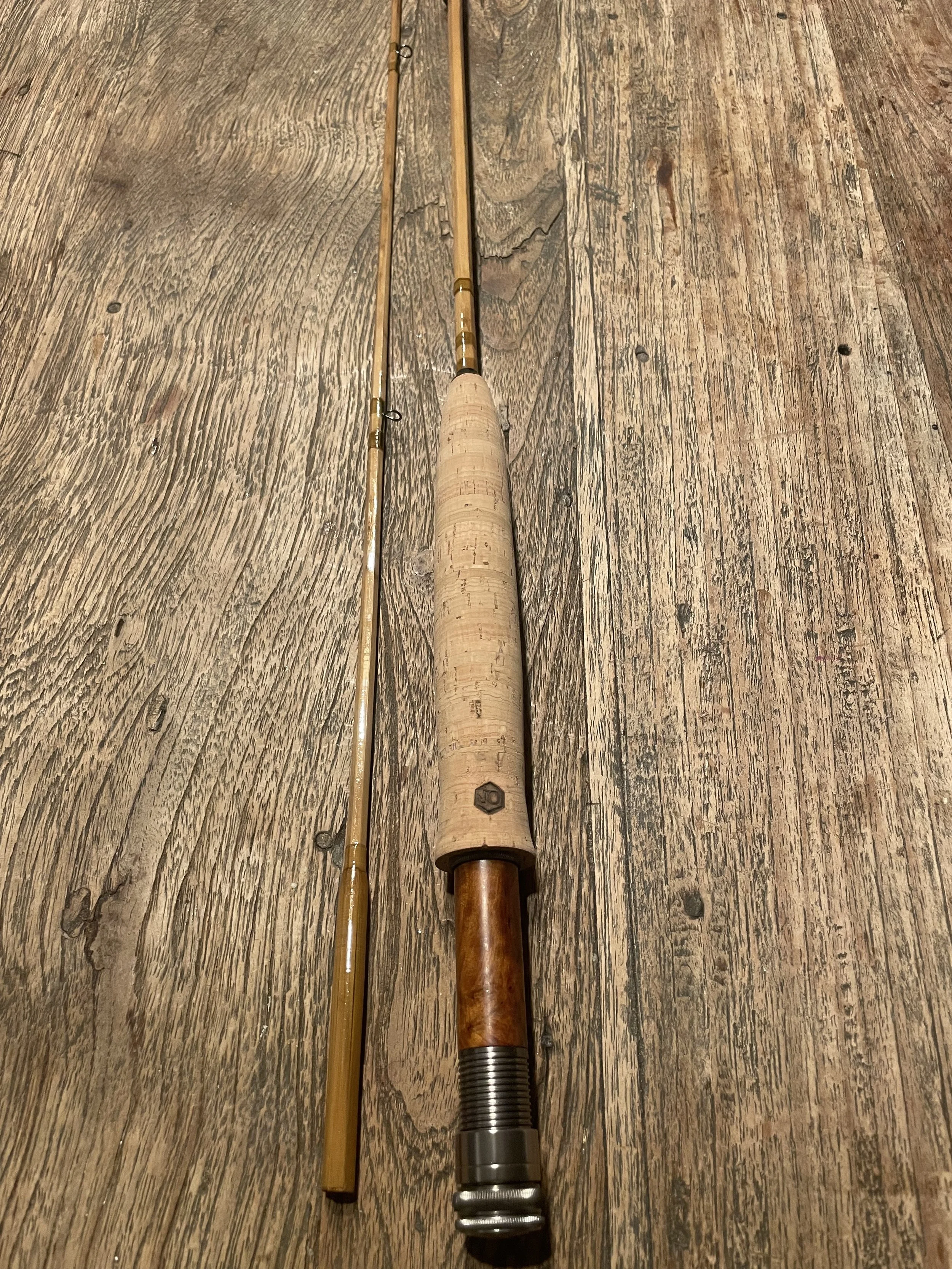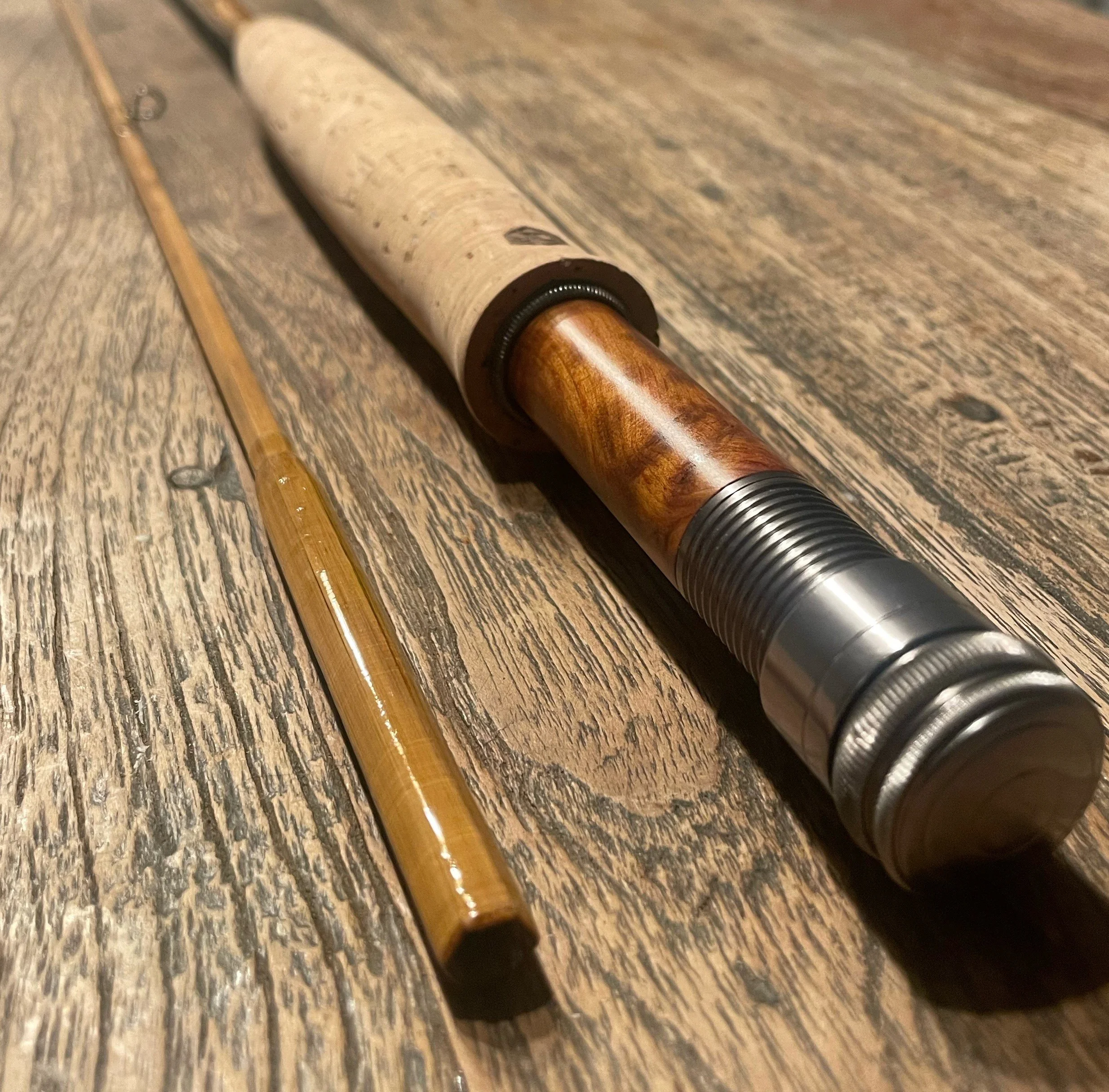 It is finished with hand-planed bamboo ferrules, gunsmoke snake guides, and a beautifully figured burled wood reel seat, giving it both elegance and durability. The rod is wrapped in light olive Pearsall’s Gossamer silk, accented with fine brown silk tipping, creating a subtle and timeless aesthetic.